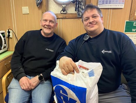 Tá vitjað varð umborð á Hav Skandic við pakkum, fekk trúboðarin orðið á skiparan, Janus Berthelsen og stýrimannin, Andras Magnussen. Teir siga sum við ein munn: