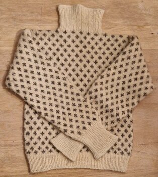 It is said that many jumpers were knitted in Eiði during the war. This was winter work, and people often sacrificed sleep and sat knitting late into the night. The men spun and carded the wool while the women did the knitting.